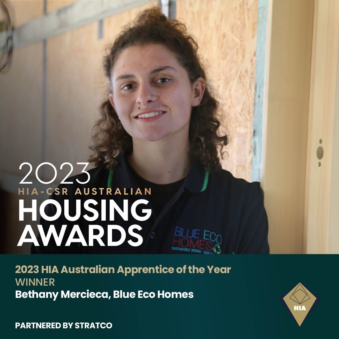 The award this year went to Bethany Mercieca, a carpenter working for Blue Eco Homes in New South Wales. Bethany received this award for numerous reasons. On the job, Bethany has established meaningful relationships with her co-workers through her exceptional communication skills, whilst delivering an enthusiastic work ethic. Additionally, her problem-solving skills are beyond the competency of an apprentice level. Outside of work, she has made a significant contribution in supporting youth who are deciding on a trade career by speaking at schools and is heavily involved in numerous industry committees. A massive congratulations to Bethany on her achievements and we look forward to watching your accomplishments in the future.
