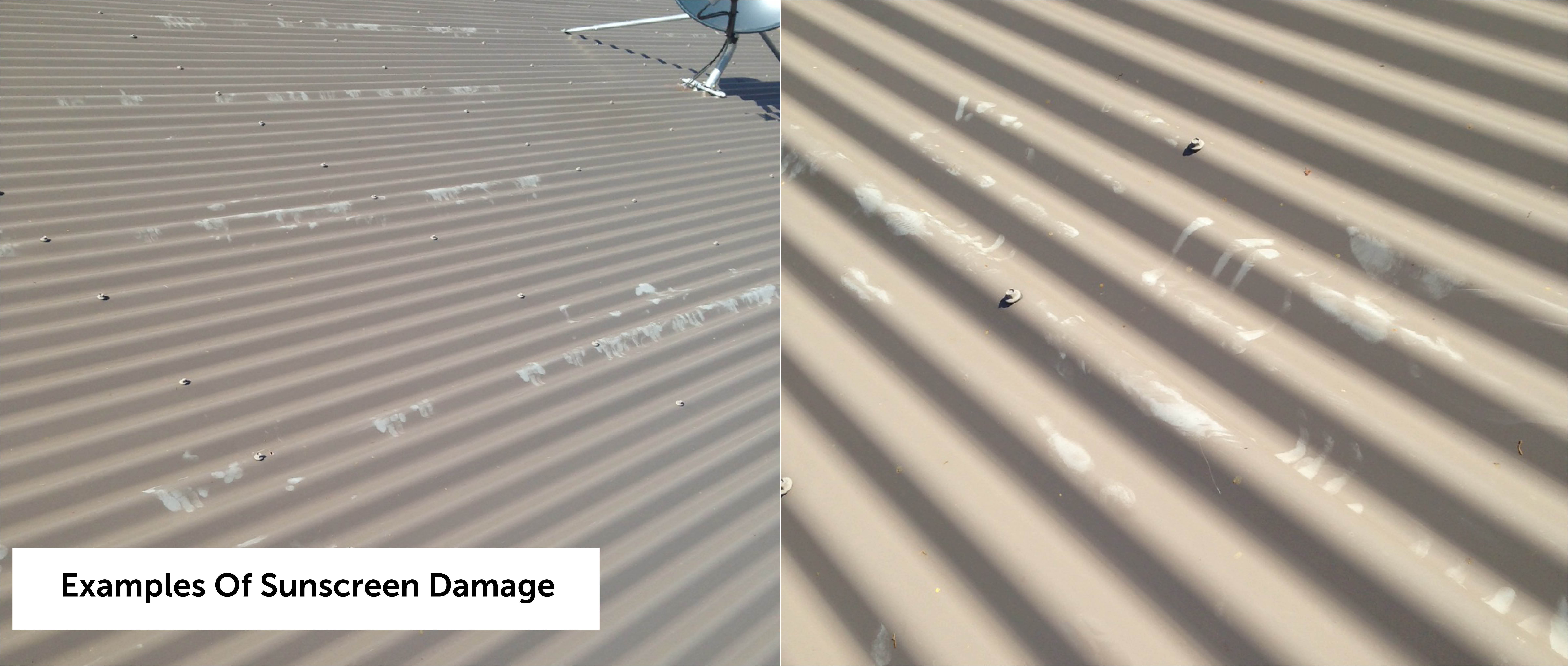 Damage occurs when products such as sunscreen, containing semiconducting oxides including titanium dioxide (TiO2) and zinc oxide (ZnO) accelerate the degradation of the paint systems in your roofing material. The results when this occurs can be seen in the roofing images below.