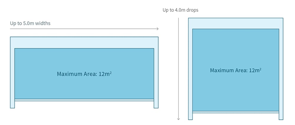 Stratco recommends a maximum total area of up to 12m2 for each blind. The maximum width is 5.0 metres, and the maximum drop is 4.0 metres. If the size you are after is outside of these measurements please speak to your local store.