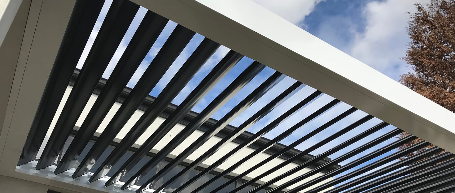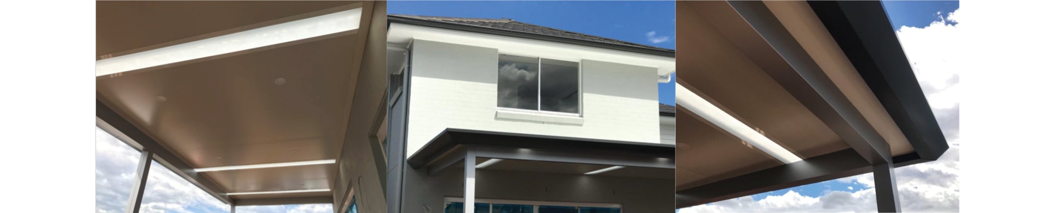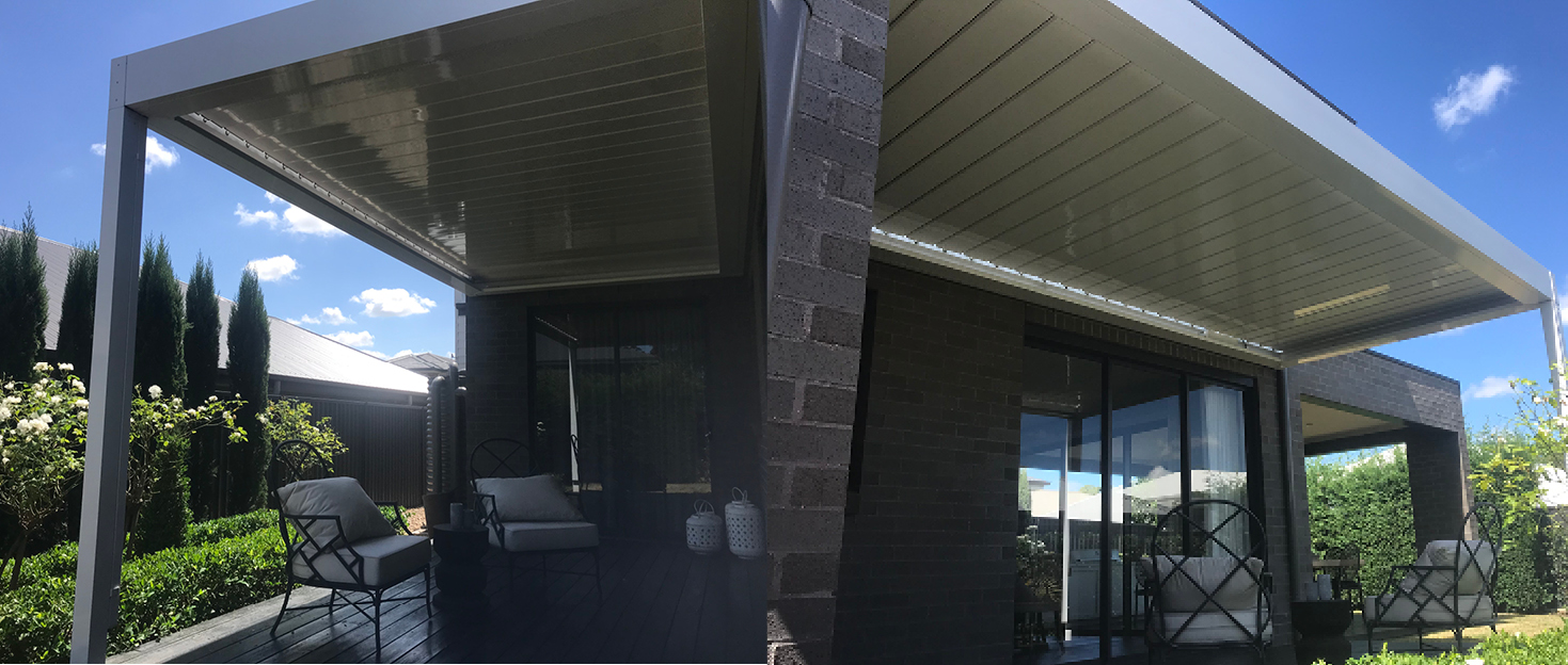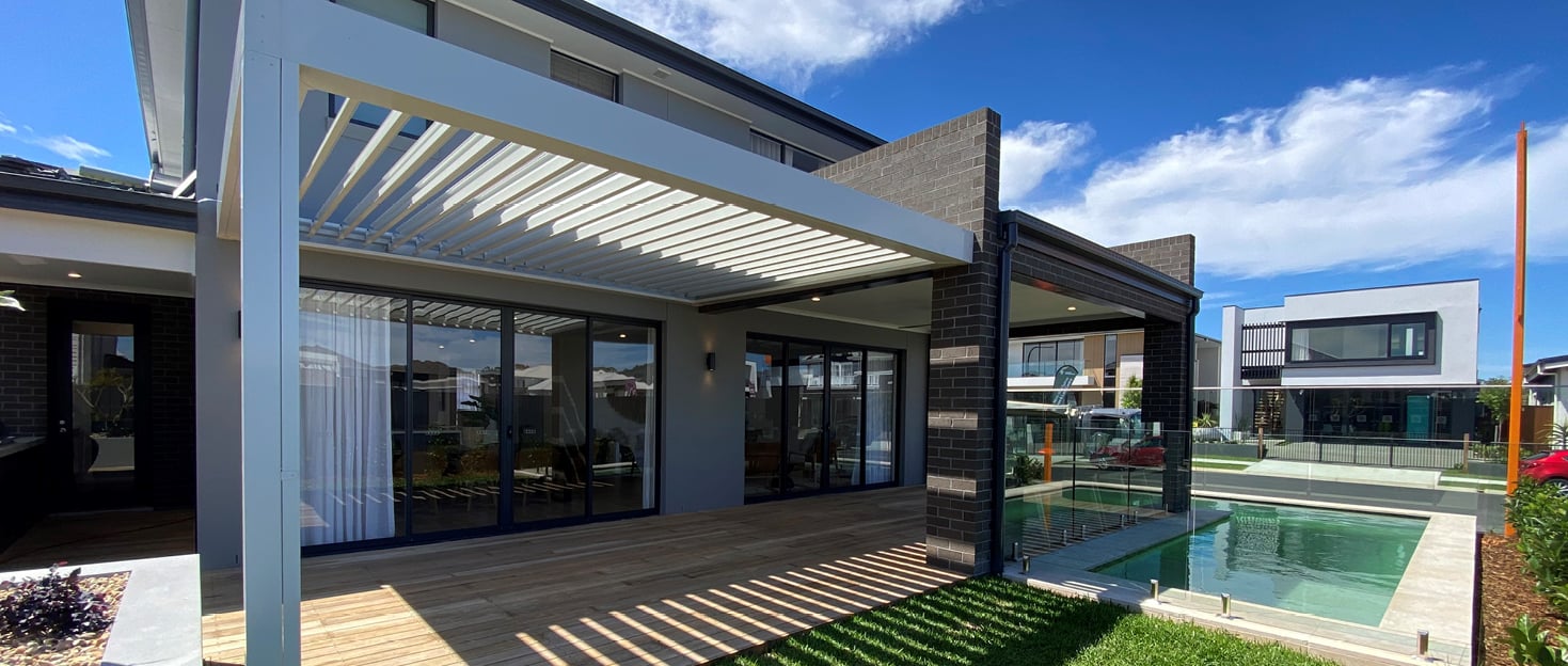 This Warwick Farm display features the Pavilion Allure, offering the best in all-season alfresco living with opening and closing louvres. The remote-controlled opening louvres have a flat ceiling appearance when closed as shown by this display home. The closed louvres will prevent rain, create shade and help ventilation control throughout the year.