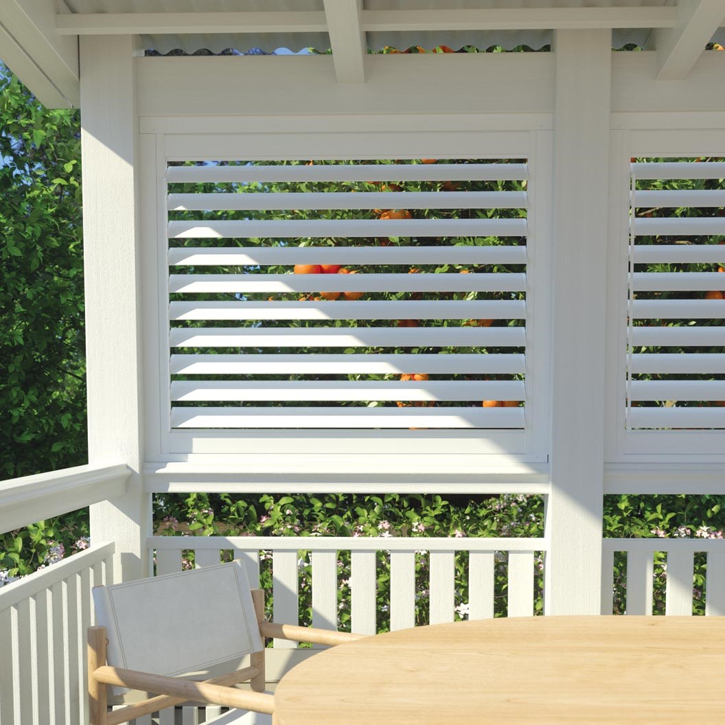 Nirvana shutters are a stylish horizontal operable louvre solution offering a range of benefits such as enclosing an external void space, protection from natural elements or providing privacy to patio enclosures.