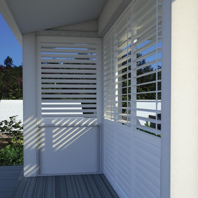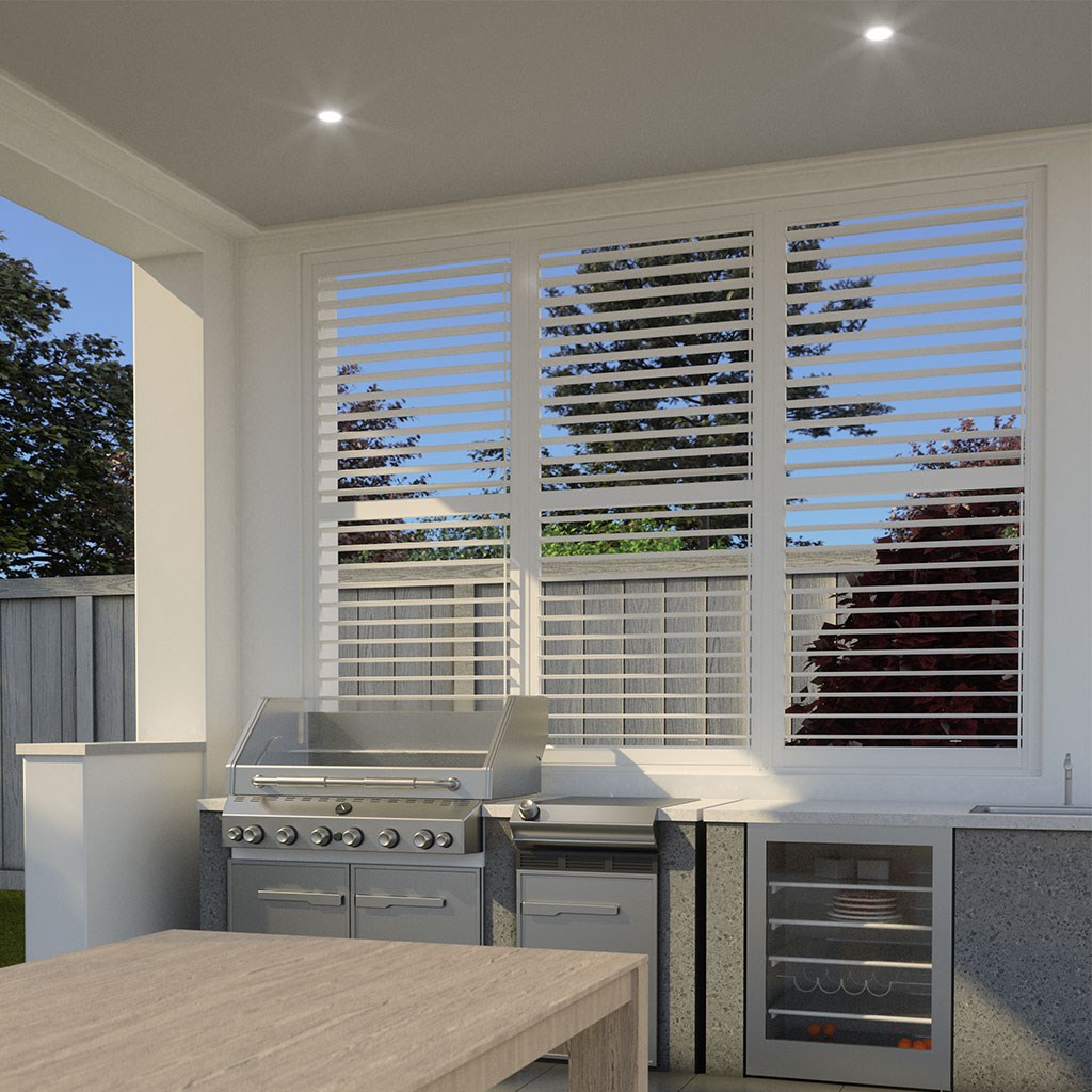 Nirvana shutters are an entertainer's dream, turning your outdoor living area into a modern secluded sanctuary that can be enjoyed all year round. The high-quality aluminum panels are fully assembled and easily installed in a void opening with U channels on all four sides.