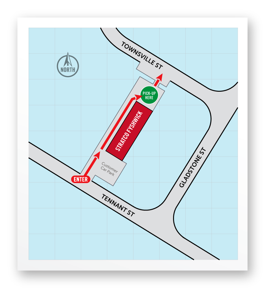 Enter via Tennant Street and continue down the left side of the building to our pickup area at the rear of the building. Exit via Townsville Street.
