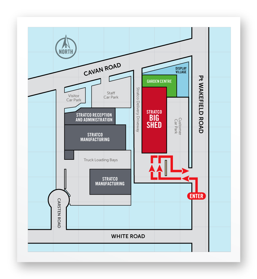 - On arrival, enter through Gate 3 and proceed to stop at the stop signs in the driveway. Please wait for a Stratco team member to approach.